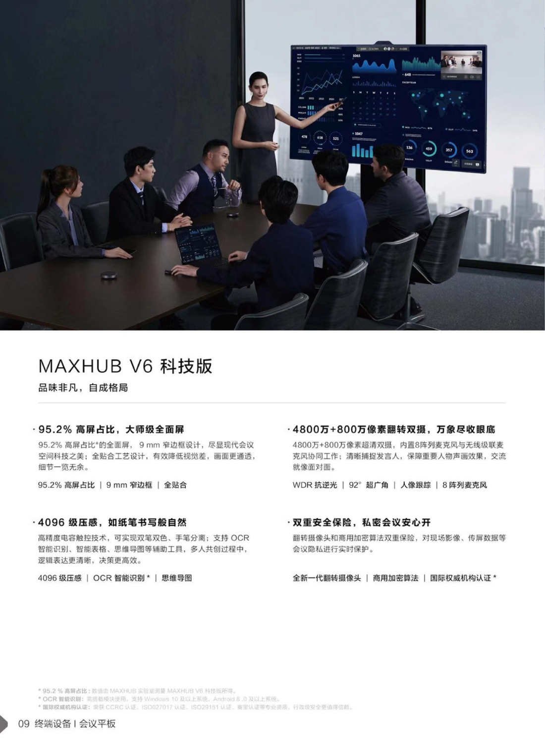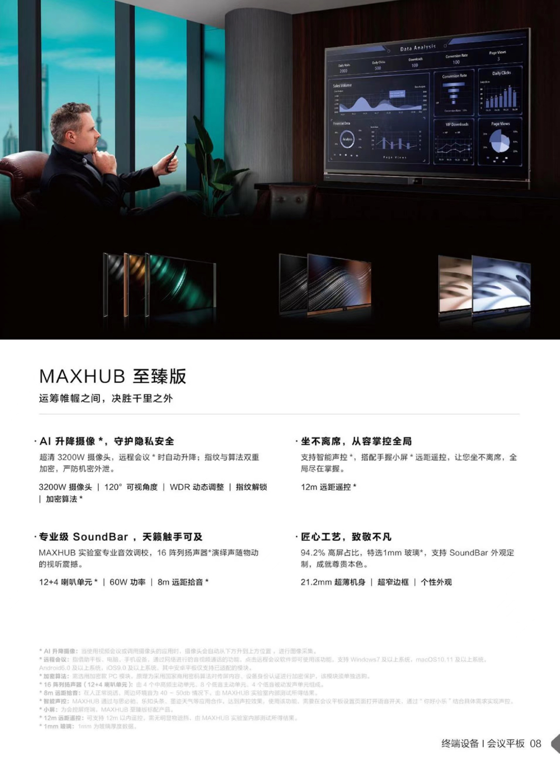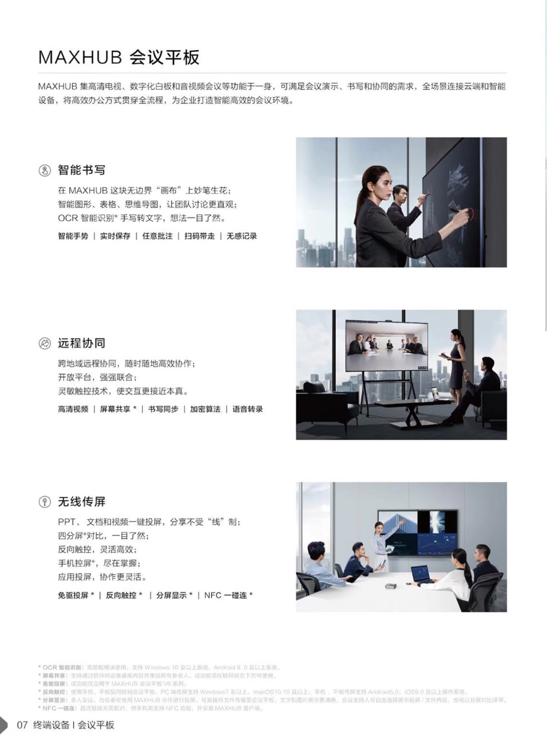 MAXHUB是視臻科技的自主*,誕生于2017年,是國內會議平板品類的開創(chuàng)者和引領者,來自第三方奧維的數據顯示,2022年MAXHUB銷量市占率達28.8%。截至目前,MAXHUB已成功走進全球78個*,超50萬間會議室都能看到MAXHUB的身影,超80%中國500強企業(yè)都在使用MAXHUB提升會議和協(xié)同效率*。 創(chuàng)新成就更多可能,MAXHUB持續(xù)根據用戶需求迭代升級技術和產品。2023年,MAXHUB首度在行業(yè)內定義三大空間,發(fā)布三大空間數字化解決方案,以覆蓋全場景的協(xié)同終端新品,為組織帶來更高效的會議辦公體驗。 服務無止境,滿意無終點。MAXHUB始終堅持以“用戶為中心”,擁有完善的售后體系,2000個售后服務網點和10000名官方認證工程師,為全國用戶提供設備咨詢、送貨、安裝、培訓、維修等*專業(yè)服務,對 于一、二線城市,還提供48小時內上門服務,真正做到“只要有MAXHUB的地方,就會有 MAXHUB的服務”。 打造更好的產品,追求更高的品質,提供更優(yōu)的服務,MAXHUB將致力于提升協(xié)同共創(chuàng)的效能,把高效轉化為企業(yè)的核心生產力,為社會創(chuàng)造更大的價值。